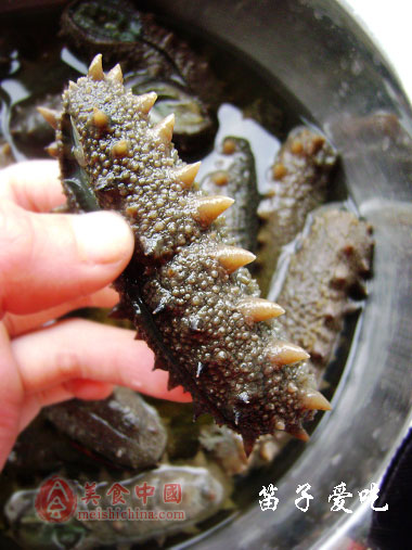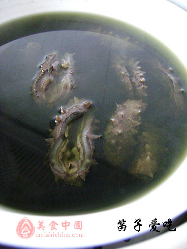 4、鍋里放入一點(diǎn)蔥油,爆香蔥姜末,加入海參,加入一點(diǎn)清湯,依次加入精鹽,料酒醬油和一點(diǎn)白糖。