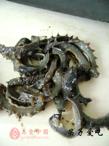 1、海參去除內(nèi)臟,煮透后控去水分,切絲。處理海參是比較繁瑣一些,不過倒沒有什么技術(shù)含量。
